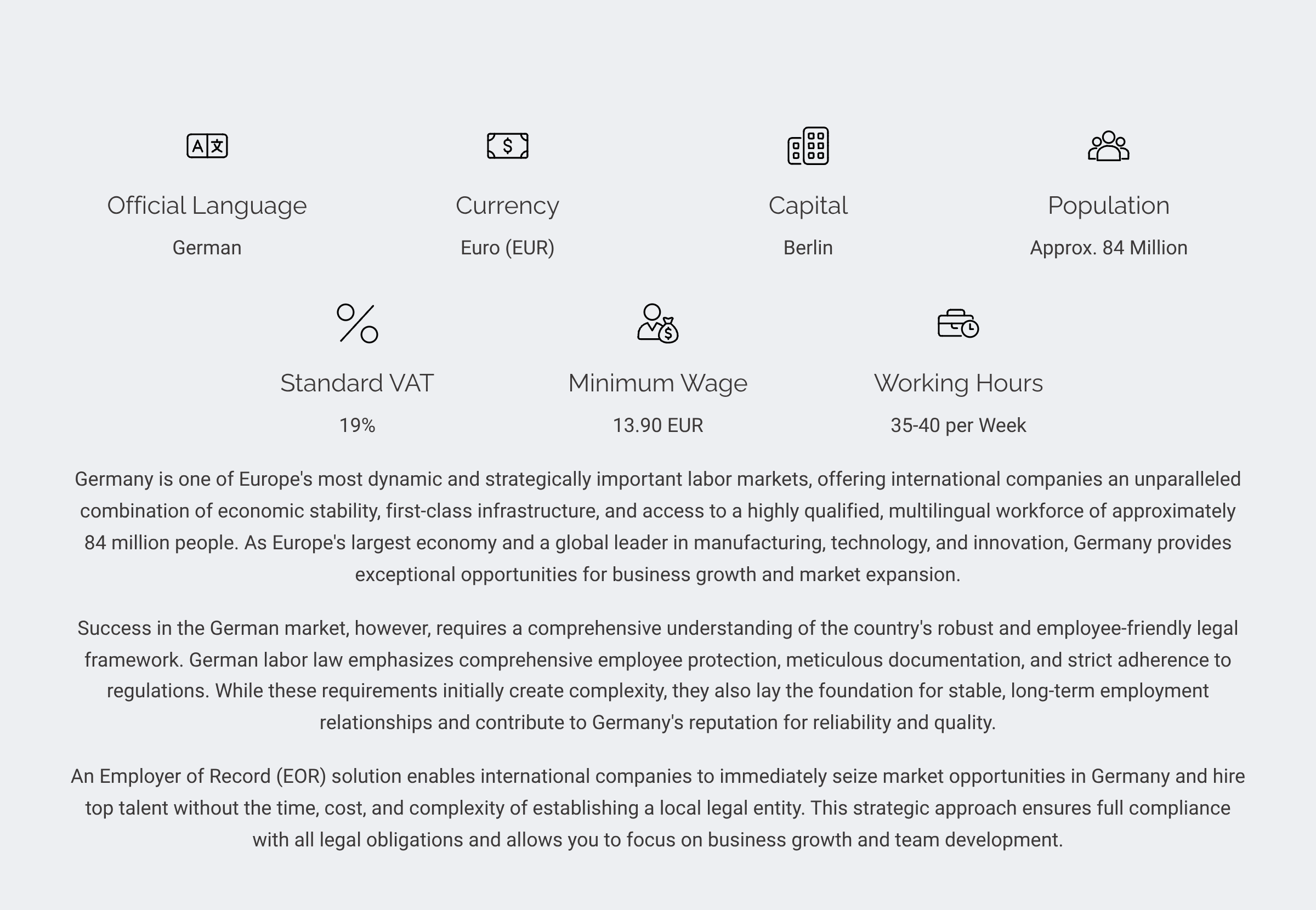 A compliant EOR enables companies to hire in Germany without setting up a local entity, while ensuring payroll, employment contracts, social security, and labor law obligations are handled correctly.